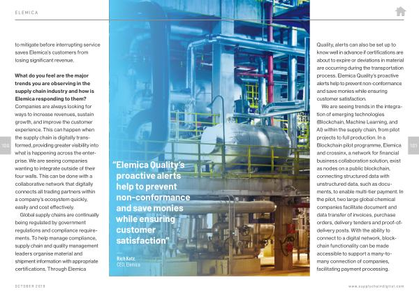 “Elemica Quality ’ s proactive alerts help to prevent non-conformance and save monies while ensuring customer satisfaction ”