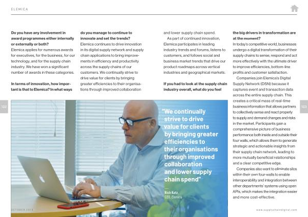 In terms of innovation , how important is that to Elemica ? In what ways do you manage to continue to innovate and set the trends ? Elemica continues to drive innovation in its digital supply network and supply chain applications to bring improvements in efficiency and productivity across the supply chains of our customers . We continually strive to drive value for clients by bringing greater efficiencies to their organisations through improved collaboration