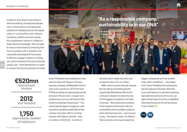 With a drive to grow through acquisition as well as promoting growth organically , Berlekamp affirms the company ’ s target is to become one of the biggest companies in its field in Europe . “ We positioned ourselves in the market environment with our sustainable and recyclable solutions early and have become – we ’ re proud to say – the best-in-class ,” he affirms . “ Since I joined , we ’ ve purchased two bigger companies and two smaller ones . We ’ re ambitious — the target is for Schur Flexibles to be among the top five players in Europe . We have to try and balance our growth in packaging materials and look at how we can gain market share from the competition following the launch of new products in the market .”