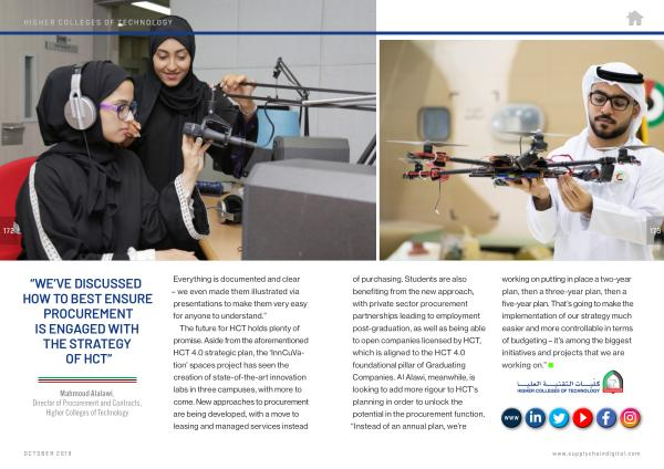 173 of purchasing . Students are also benefiting from the new approach , with private sector procurement partnerships leading to employment post-graduation , as well as being able to open companies licensed by HCT , which is aligned to the HCT 4.0 foundational pillar of Graduating Companies . Al Alawi , meanwhile , is looking to add more rigour to HCT ’ s planning in order to unlock the potential in the procurement function . “ Instead of an annual plan , we ’ re working on putting in place a two-year plan , then a three-year plan , then a five-year plan . That ’ s going to make the implementation of our strategy much easier and more controllable in terms of budgeting – it ’ s among the biggest initiatives and projects that we are working on .”