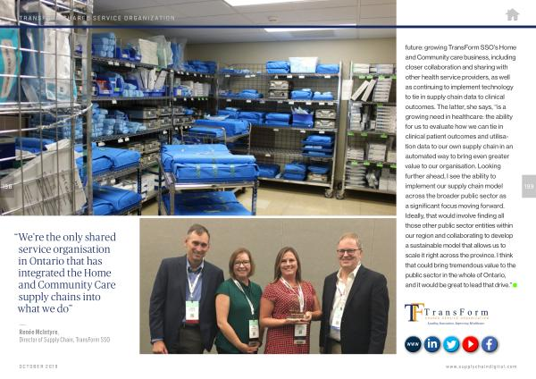 future : growing TransForm SSO ’ s Home and Community care business , including closer collaboration and sharing with other health service providers , as well as continuing to implement technology to tie in supply chain data to clinical outcomes . The latter , she says , “ is a growing need in healthcare : the ability for us to evaluate how we can tie in clinical patient outcomes and utilisation data to our own supply chain in an automated way to bring even greater value to our organisation . Looking further ahead , I see the ability to implement our supply chain model across the broader public sector as a significant focus moving forward . Ideally , that would involve finding all those other public sector entities within our region and collaborating to develop a sustainable model that allows us to scale it right across the province . I think that could bring tremendous value to the public sector in the whole of Ontario , and it would be great to lead that drive .”