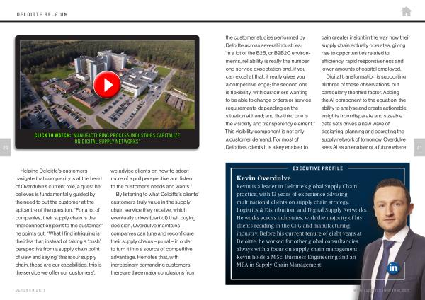 Helping Deloitte ’ s customers navigate that complexity is at the heart of Overdulve ’ s current role , a quest he believes is fundamentally guided by the need to put the customer at the epicentre of the question . “ For a lot of companies , their supply chain is the final connection point to the customer ,” he points out . “ What I find intriguing is the idea that , instead of taking a ‘ push ’ perspective from a supply chain point of view and saying ‘ this is our supply chain , these are our capabilities : this is the service we offer our customers ’,