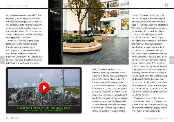 fast ’,” Overdulve explains . “ It ’ s a different mentality compared to the waterfall mentality that was prevalent before . Previously , when you went through large scale-supply chain transformations , you went off for a year to design the solution , then two years to build it , another year to test it . Then , four or five years later , it actually went live . By the time you put it live , everything has changed so much that you might wonder whether the solution is even still relevant .” Deloitte ’ s approach to digital innovation , in a world that is changing at an increasing pace , is much more agile , acknowledging the lessons learned from failure and the need for rapid adoption and adaptation . “ The ‘ think big ’ phase is about envisioning the art of the possible of what a company ’ s future supply network could look like , which technologies it needs to explore to realise this vision and which are the most apparent supply chain areas to tackle in light of continuous business challenges . We create a constantly evolving roadmap for the company . Then , the ‘ start small ’ element involves us solving a specific business issue , rather than trying to boil the ocean . We take one of the core use cases that could drive benefit for a company , we match that with the right technology to solve the challenge , and we do a pilot . Finally , the ‘ scale fast ’ part is about finding other areas where the solution prototype can be leveraged to create momentum at scale and start expanding the technology for adoption across the company .”