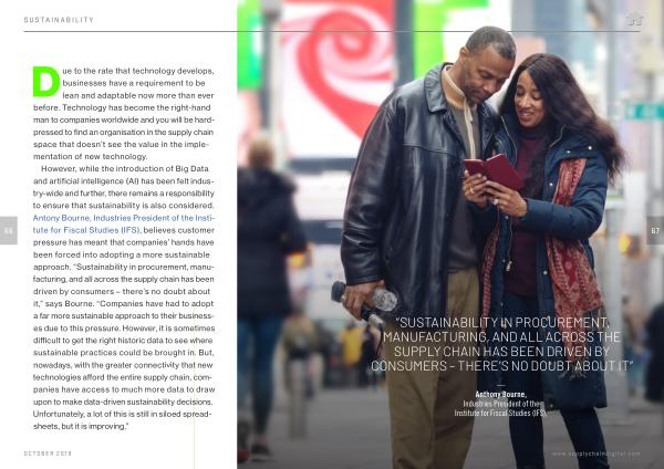 However , while the introduction of Big Data and artificial intelligence ( AI ) has been felt industry-wide and further , there remains a responsibility to ensure that sustainability is also considered . Antony Bourne , Industries President of the Institute for Fiscal Studies ( IFS ), believes customer pressure has meant that companies ’ hands have been forced into adopting a more sustainable approach . “ Sustainability in procurement , manufacturing , and all across the supply chain has been driven by consumers – there ’ s no doubt about it ,” says Bourne . “ Companies have had to adopt a far more sustainable approach to their businesses due to this pressure . However , it is sometimes difficult to get the right historic data to see where sustainable practices could be brought in . But , nowadays , with the greater connectivity that new technologies afford the entire supply chain , companies have access to much more data to draw upon to make data-driven sustainability decisions . Unfortunately , a lot of this is still in siloed spreadsheets , but it is improving .”