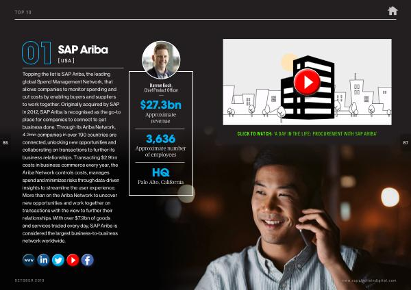 Topping the list is SAP Ariba , the leading global Spend Management Network , that allows companies to monitor spending and cut costs by enabling buyers and suppliers to work together . Originally acquired by SAP in 2012 , SAP Ariba is recognised as the go-to place for companies to connect to get business done . Through its Ariba Network , 4.2mn companies in over 190 countries are connected , unlocking new opportunities and collaborating on transactions to further its business relationships . Transacting $ 2.9trn costs in business commerce every year , the Ariba Network controls costs , manages spend and minimizes risks through data-driven insights to streamline the user experience . More than on the Ariba Network to uncover new opportunities and work together on transactions with the view to further their relationships . With over $ 7.9bn of goods and services traded every day , SAP Ariba is considered the largest business-to-business network worldwide .