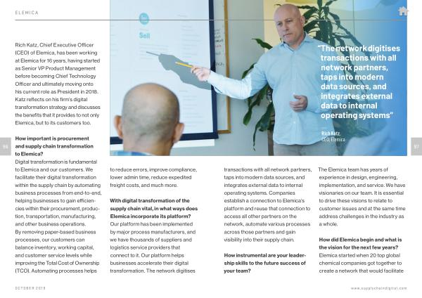 How important is procurement and supply chain transformation to Elemica ? Digital transformation is fundamental to Elemica and our customers . We facilitate their digital transformation within the supply chain by automating business processes from end-to-end , helping businesses to gain efficiencies within their procurement , production , transportation , manufacturing , and other business operations . By removing paper-based business processes , our customers can balance inventory , working capital , and customer service levels while improving the Total Cost of Ownership ( TCO ). Automating processes helps to reduce errors , improve compliance , lower admin time , reduce expedited freight costs , and much more .