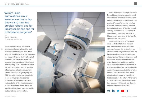 Looking to the future , Tamvakis sees a lot of automation happening . “ We are using automations in our warehouses day to day , but we also have two surgical robots , one for laparoscopic and one for orthopaedic surgeries . We ’ re seeing more and more new technologies emerging which is exciting and important to drive paperless operations . I believe this is something that not only healthcare will experience , but a lot of other sectors too .” Tamvakis also reiterates the importance of identifying hidden costs in the future . “ There are a lot of costs that we have not taken into account in the past , but they do make a difference over time .”