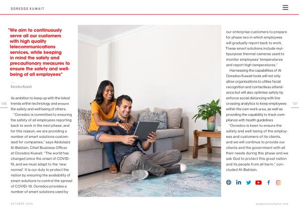 “ Ooredoo is committed to ensuring the safety of all employees reporting back to work in the next phase , and for this reason , we are providing a number of smart solutions customised for companies ,” says Abdulaziz Al-Babtain , Chief Business Officer at Ooredoo Kuwait . “ The world has changed since the onset of COVID- 19 , and we must adapt to the ‘ new normal ’. It is our duty to protect the nation by ensuring the availability of smart solutions to control the spread of COVID-19 . Ooredoo provides a number of smart solutions used by
