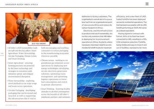 Electricity , and the infrastructure to produce and use it sustainably , are not the only solutions that AB InBev is deploying for its procurement operations in Africa . Its plants , where necessary , have been relaid to accommodate its forklift trucks for maximum efficiency , and a new fleet of LNGfueled forklifts has been deployed across its continental operations . The trial has been successful , with its LNG forklift performing at 100 % the same as a diesel equivalent .