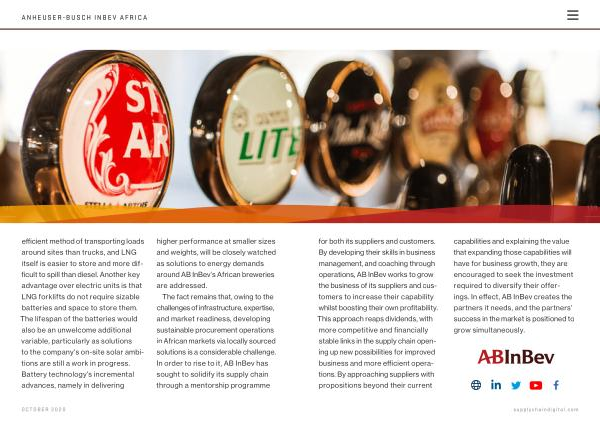148 efficient method of transporting loads around sites than trucks , and LNG itself is easier to store and more difficult to spill than diesel . Another key advantage over electric units is that LNG forklifts do not require sizable batteries and space to store them . The lifespan of the batteries would also be an unwelcome additional variable , particularly as solutions to the company ’ s on-site solar ambitions are still a work in progress . Battery technology ’ s incremental advances , namely in delivering higher performance at smaller sizes and weights , will be closely watched as solutions to energy demands around AB InBev ’ s African breweries are addressed .