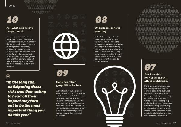 For supply chain professionals , Black Swan events can come in all shapes and sizes , from a macro disruption , such as war in Ukraine or a cargo ship accidentally corking the Suez Canal , to a company-specific problem , such as the failure of a subcontractor . In the long run , anticipating those risks and then acting to head off their impact may turn out to be the most important thing you do this year .