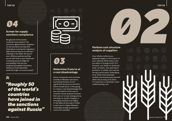 How inflation affects you depends largely on the inputs of your offering . What input costs are likely to change most ? If in the past , you relied on Ukrainian steel , car parts , coal , petroleum products , or wheat , you may be facing a particularly challenging time . Given that extended volatile and recessionary periods often last as long as 15 years , it ’ s important to develop a clear understanding now . supplychaindigital . com 139
