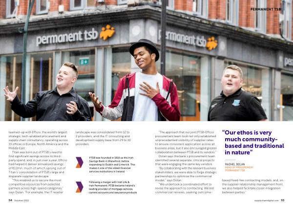 Titan was born out of PTSB ’ s need to find significant savings across its thirdparty spend , and , in just over a year , Efficio had helped it deliver annualised savings of € 12mn , much of which sprung out of Titan ’ s consolidation of PTSB ’ s large and disparate supplier landscape .