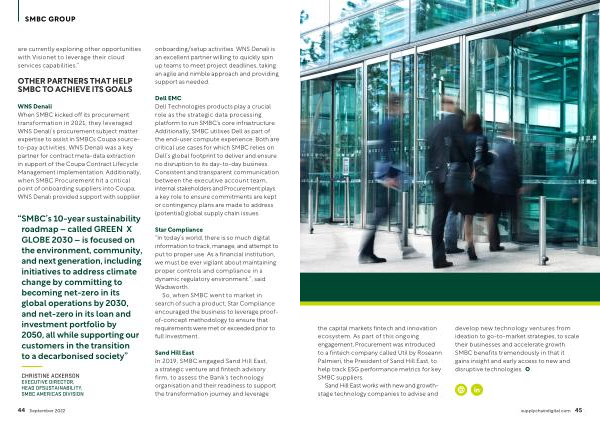 WNS Denali When SMBC kicked off its procurement transformation in 2021 , they leveraged WNS Denali ’ s procurement subject matter expertise to assist in SMBCs Coupa sourceto-pay activities . WNS Denali was a key partner for contract meta-data extraction in support of the Coupa Contract Lifecycle Management implementation . Additionally , when SMBC Procurement hit a critical point of onboarding suppliers into Coupa , WNS Denali provided support with supplier